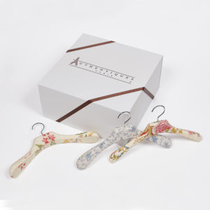 Les cintres en bois ou gainés sont enveloppés dans un délicat papier de soie pour les protéger et placés dans des emballages ou des boîtes précieuses fermées avec un ruban de coton pour rendre le cadeau encore plus époustouflant !